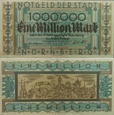 Нотгельд города Нюренберг номиналом Один миллион марок. Банкнота из обращения. Состояние банкноты смотри на скане.